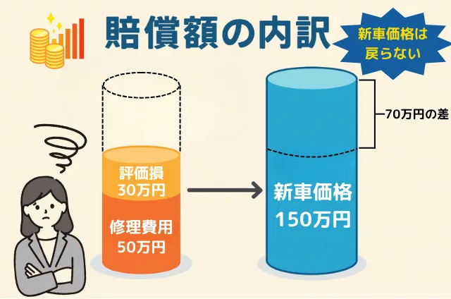 賠償額の上限はあくまで事故時点での車両時価額であり、修理費用や評価損(事故による価値の下落分)が主な賠償対象となります。